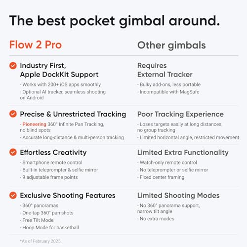 - Alle wichtigen Werkzeuge in einem AI Phone Gimbal. Integriertes Stativ für iPhone/Android-Aufnahmen, Selfie-Stick, Selfie-Spiegel, Teleprompter, Powerbank und 10 Stunden Akkulaufzeit. Mit dem Flow 2 Pro bist du für einen ganzen Drehtag gerüstet – keine weitere Ausrüstung nötig.