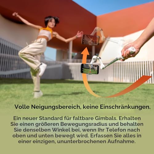 - Kreative Aufnahmen mit freiem Neigungsmodus: Ein neuer Standard für faltbare Gimbals. Erhalte einen größeren Bewegungsspielraum und halte den selben Winkel bei, während sich dein Handy auf und ab bewegt. Nimm alles in einer einzigen, durchgehenden Aufnahme auf.
