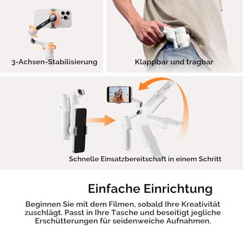 - Einfache Einrichtung und stabile Aufnahmen: Befestige dein Handy, klappe es aus und schon ist dieser Handy-Gimbal einsatzbereit. Die 3-Achsen-Stabilisierung sorgt dafür, dass jede Aufnahme seidenweich wird, egal in welcher Situation.